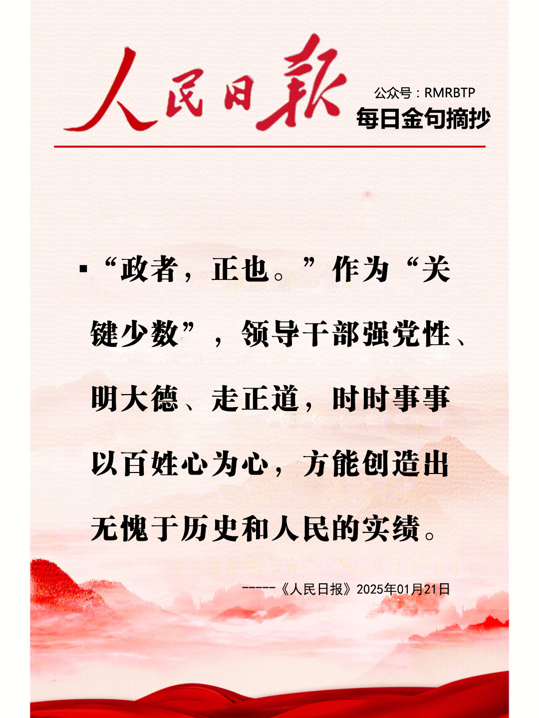 “政者,正也。”作为“关键少数”,领导干部强党性、明大德、走正道,时时事事以百姓心为心,方能创造出无愧于历史和人民的实绩。----《人民日报》2025年01月21日