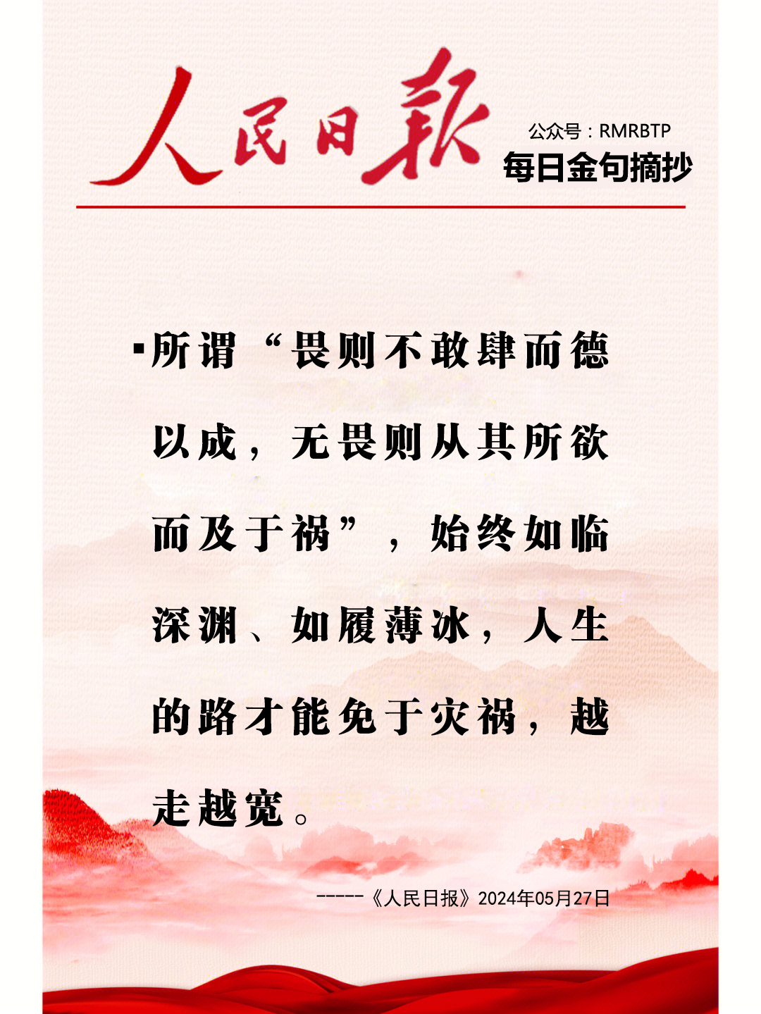 所谓“畏则不敢肆而德以成,无畏则从其所欲而及于祸”,始终如临深渊、如履薄冰,人生的路才能免于灾祸,越走越宽。----《人民日报》2024年05月27日