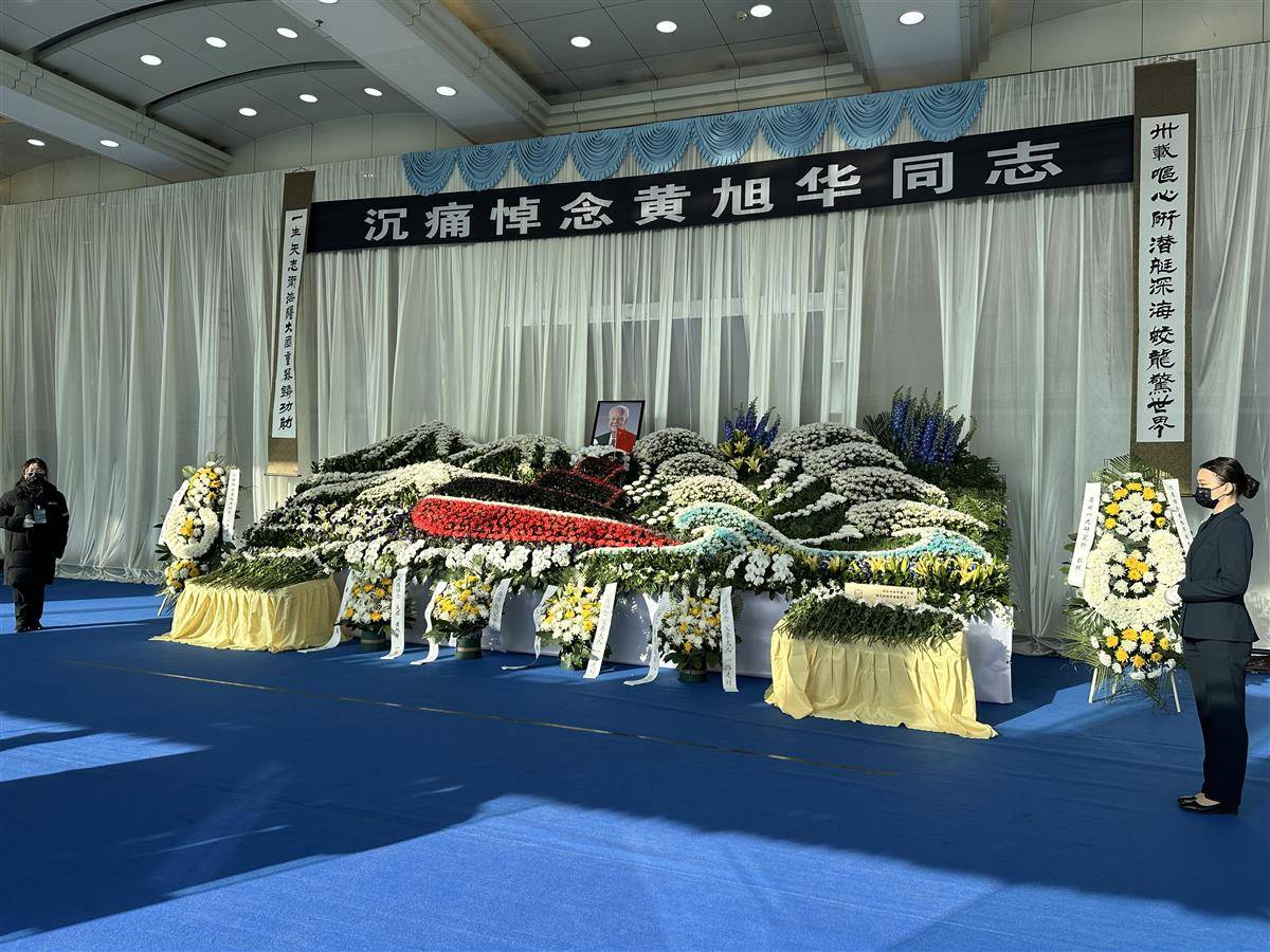 步入大厅,黄旭华院士的遗像摆放在鲜花翠柏间,鲜花和绿植特别摆放成潜艇造型,“潜艇”顶部插着一面五星红旗,仿若在海中破浪前行。挽联“卅载呕心研潜艇,深海蛟龙惊世界;一生矢志卫海疆,大国重器铸功勋”是黄老一生的写照。