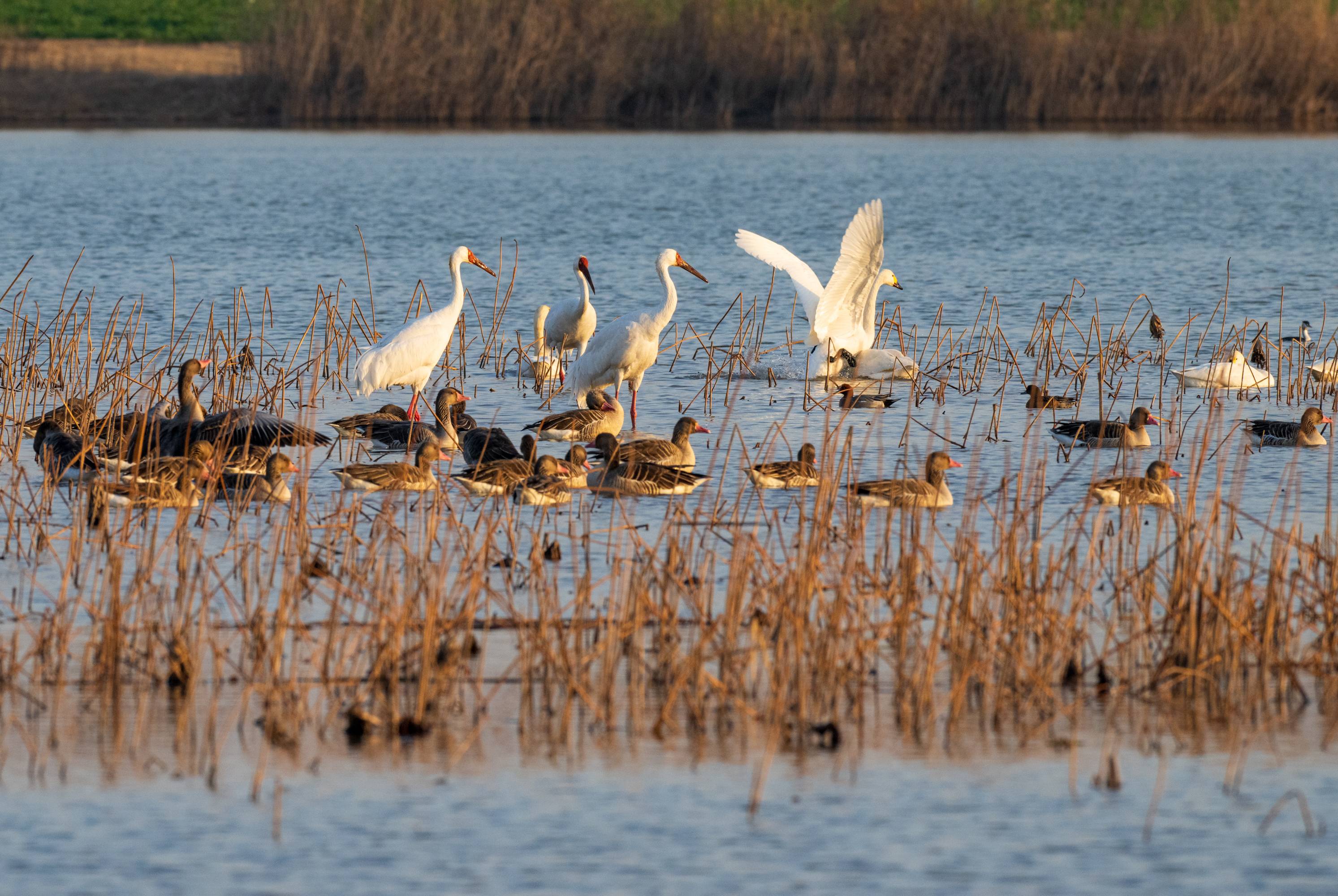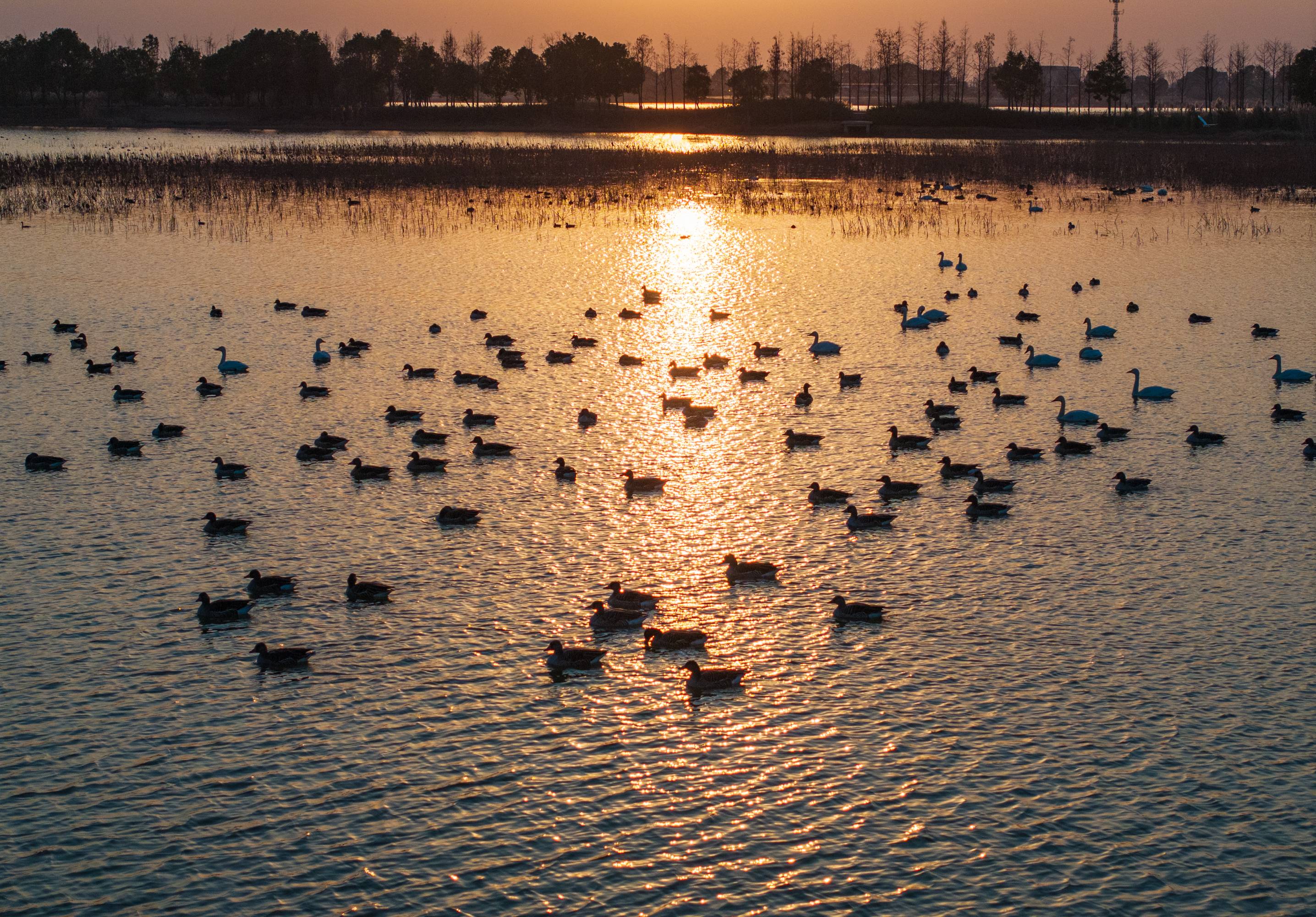 2月9日,成群候鸟在当阳市草埠湖镇季家湖湿地公园觅食嬉戏。近日,大批候鸟在当阳市季家湖国家湿地公园,夕阳下它们成群结队在浅滩觅食、休憩,成为一道美丽的风景线。(视界网 雷勇 摄)