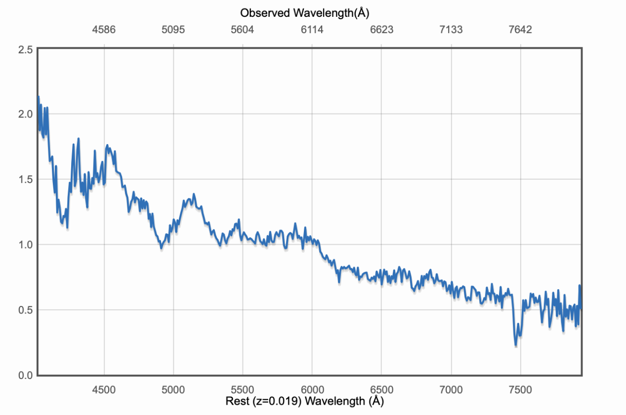 2月6日6时许,贝尔法斯特女王大学和牛津大学联合组成的河外暂现源团队(O×QUB)使用安装在利物浦望远镜(LT)上的暂现源快速采集光谱仪(SPRAT)对该候选体进行了光谱观测。当晚23时许,牛津大学物理系Shubham Srivastav博士将光谱及分类报告上传到TNS,证认该候选体是一颗Ia-91T-like型超新星,红移0.019。该候选体编号随之变更为超新星编号SN 2025aue。