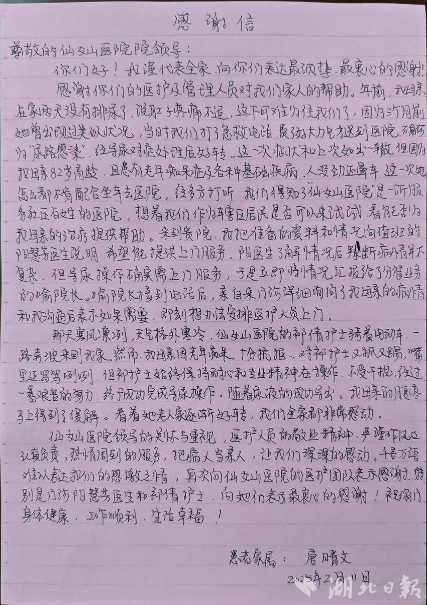 湖北日报客户端讯(通讯员鲁聪)近日,汉川市仙女山医院门诊医护收到了一封患者手写感谢信,表达了对该院医务工作者的认可与感激。一封书信,记录了医患双向奔赴的故事。