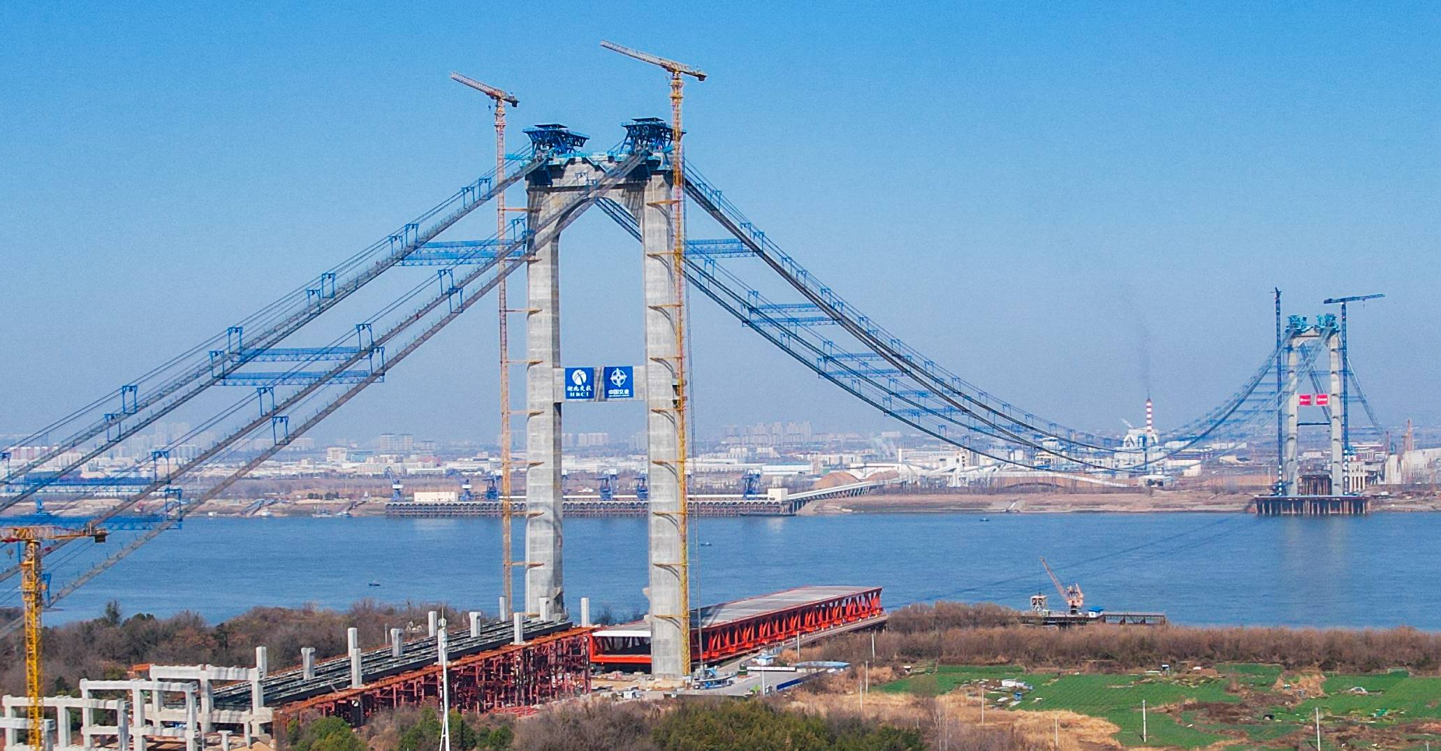 2月11日,建设中的燕矶长江大桥鄂州侧。
