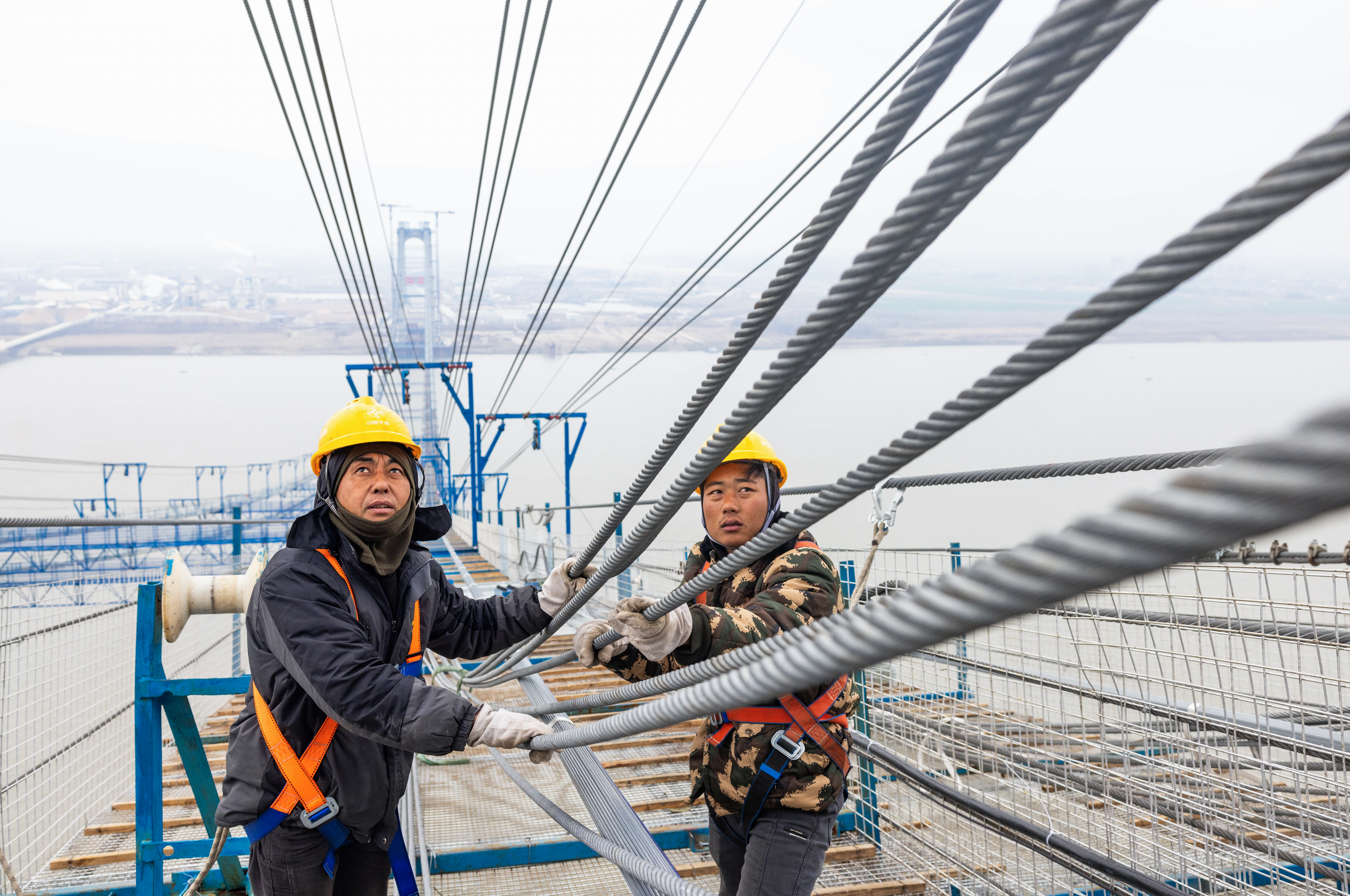 2月11日,燕矶长江大桥鄂州侧,工人冒着寒风在猫道上检查悬索。