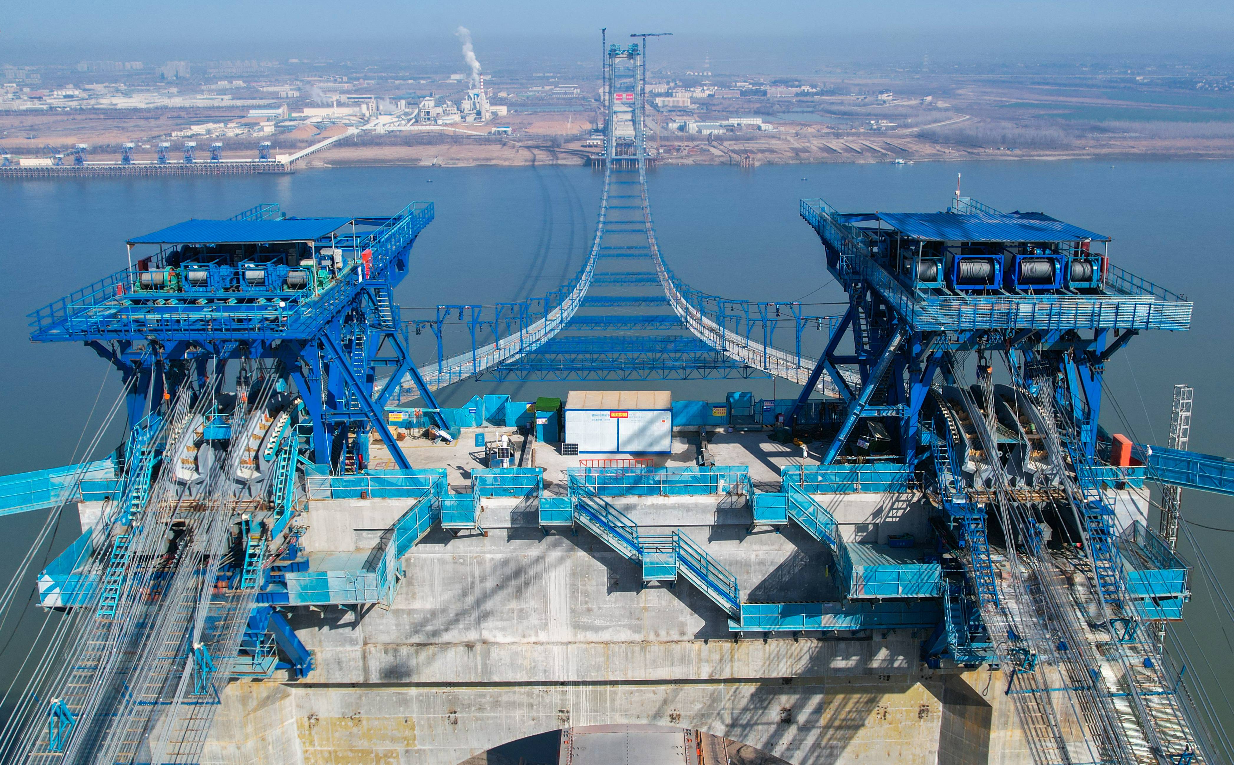 2月11日,燕矶长江大桥鄂州侧,工人冒着寒风在猫道上检查悬索。目前,燕矶长江大桥进入主悬索架设阶段,建设者正铆足干劲加紧施工,冲刺早日建成通车。燕矶长江大桥是世界最大跨径四主缆悬索桥,同时也是世界首座不同垂度四主缆双层钢桁梁悬索桥,大桥主跨1860米,上层为高速公路,下层为城市快速路。项目建成通车后,将联通花湖国际机场,推进武鄂黄黄一体化发展。(湖北日报全媒记者 薛婷 通讯员 葛利龙 陆落义 摄)