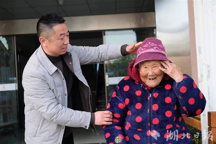 2月12日,枣阳市九鼎养老公寓里,胡波扶正仇可林戴歪的帽子。(湖北日报全媒记者 吴宇睿 摄)