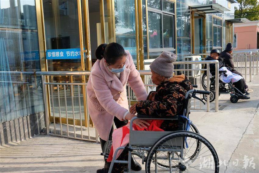 2月12日,枣阳市九鼎养老公寓内,护工正在为晒太阳的老人盖好薄被。(湖北日报全媒记者 吴宇睿 摄)