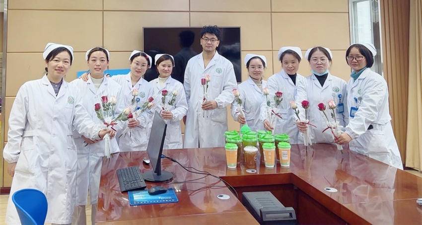 “今天是表达爱的节日,我们也给各位护士姐姐们送上美丽的祝福——鲜花和奶茶,以花为礼,致敬你们。希望你们能以愉悦的心情开启这个浪漫的日子,感谢各位平时工作中的默默付出,对我这个新手医生弟弟的照顾与帮助。希望我们以后能继续愉快共事,以饱满的热情、精湛的医术、专业的态度为患者服务。”刚来科室不到一年的“95后”医师刘静超表示。