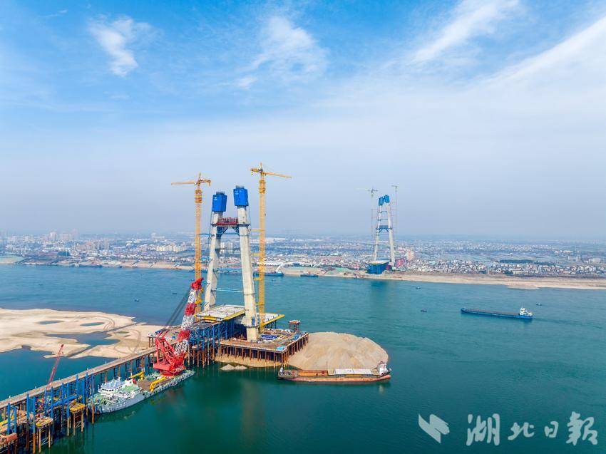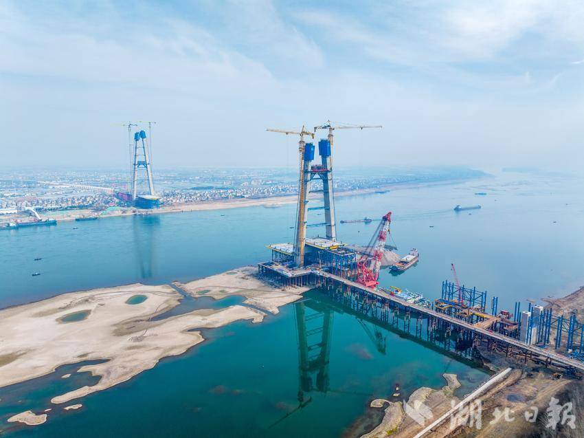2月16日,宜昌枝江长江大桥建设现场一片繁忙,建设单位采取“白加黑24小时轮班制”加快进度。