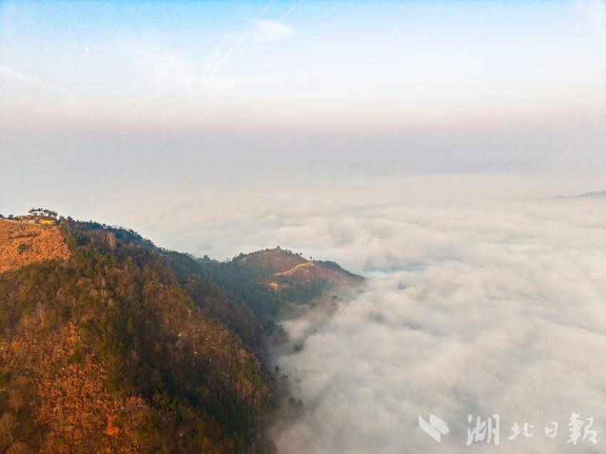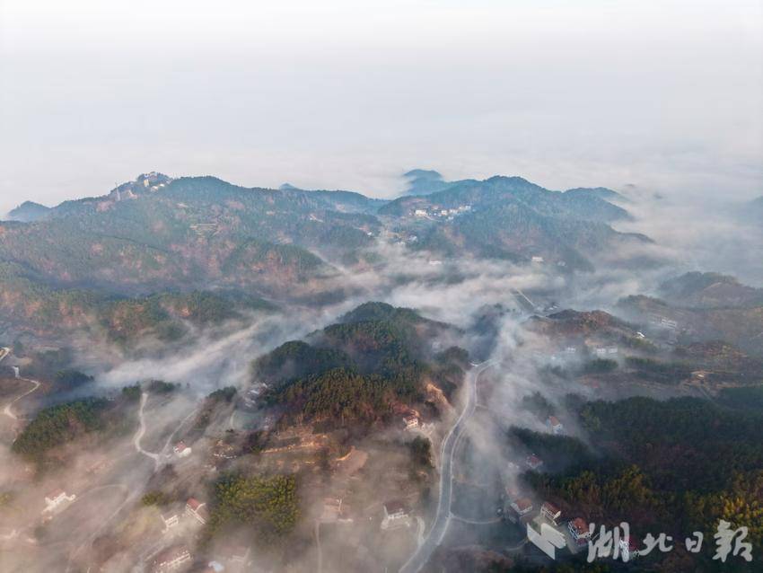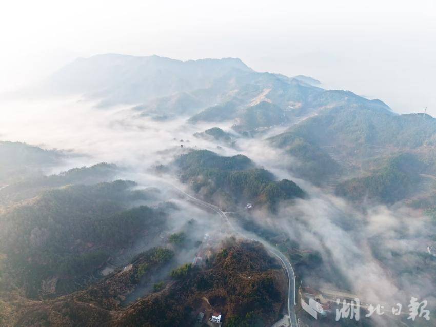 2月16日,晨雾下的英山县温泉镇百丈河片区,云雾弥漫,连绵起伏的大山与民居、公路、田园等交相辉映,构成一幅如诗如画的美丽乡村画卷。(视界网 王江 摄)