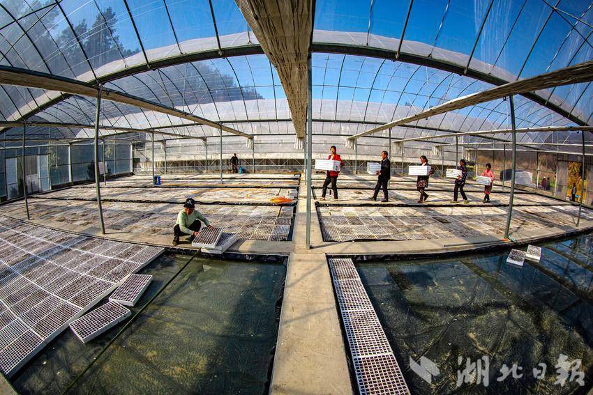 2月15日,在竹山县深河乡双湾村温室大棚里,村民正在把烟叶育苗盘摆放在营养液上。
