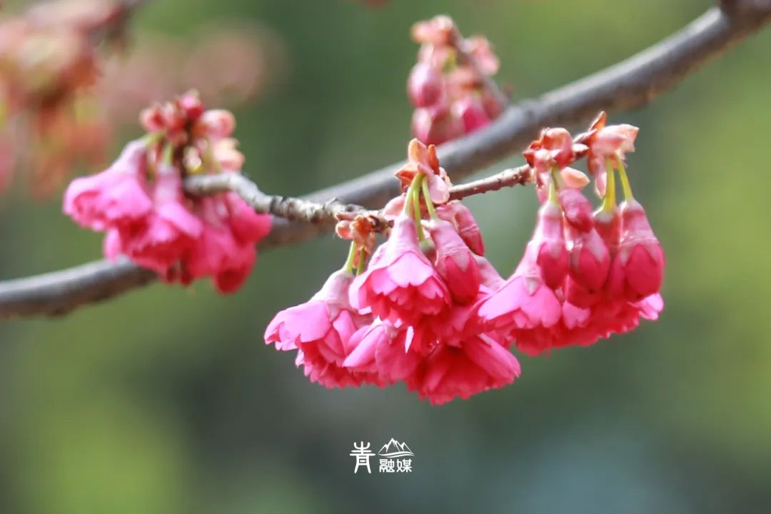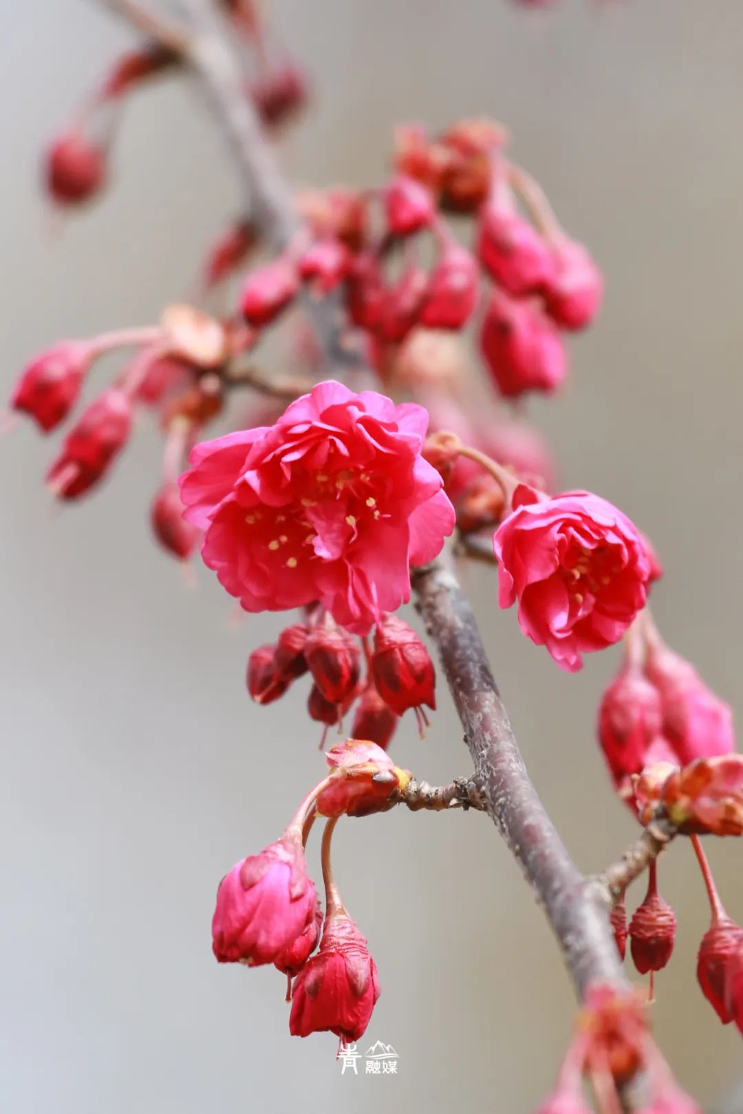 有着“报春樱”之称的红色高盆樱,大多含苞待放,微微探出的小脑袋,在春风中微微摇曳,迎接着每一位前来赏春的游人。