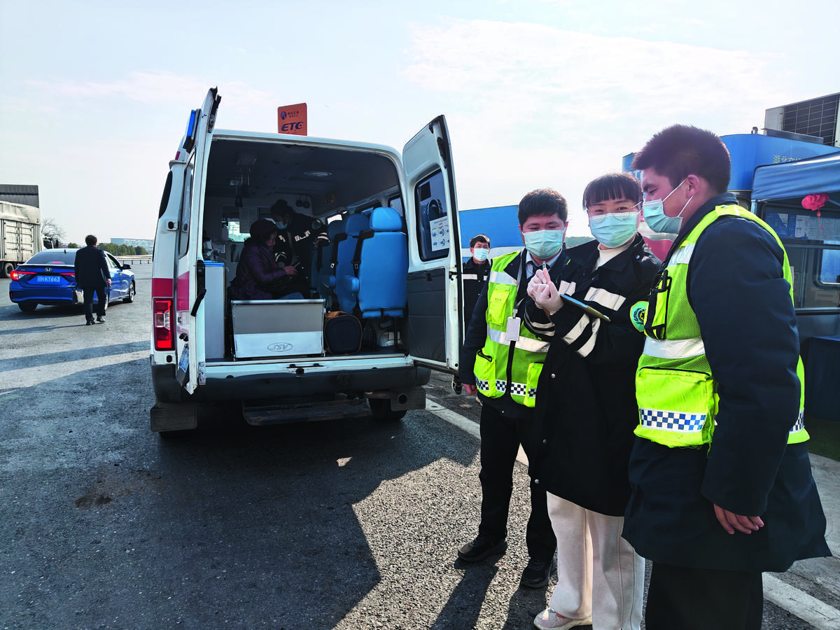 1月19日14时,一辆救护车紧急停靠在武汉北管理所广场边,车上的医护人员下车张望着收费站出口方向,正焦急等待。和畅志愿服务队队员张猛、刘道羽立即上前询问,得知有一辆小客车发生擦碰后,车上老人身体突发不适,需要紧急救治。