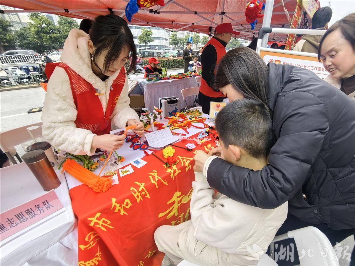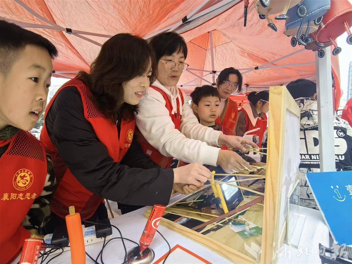 走进文明集市,32个暖心摊位依次排开,每个摊位前都围满了群众。在樊城水星台社区“从头爱你”义剪摊位前,志愿者理发师动作利落,边剪发边与市民唠家常;在科技智能展示区,襄阳市科技馆的科普志愿者带来的机器人和机器狗展示,小朋友拍手称赞;大漆、木版年画、剪纸等非遗项目,吸引大家驻足体验。