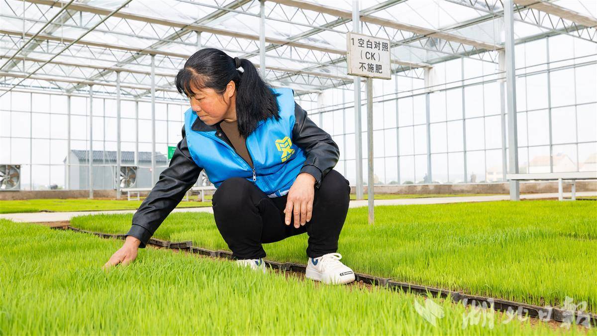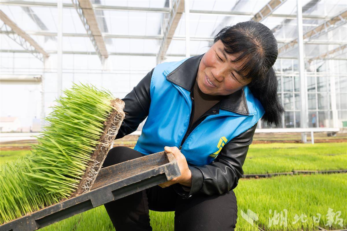 2025年3月10日,在湖北省钟祥市喜来丰农事综合服务中心,工作人员正在育秧大棚检查秧苗基质片。据了解,基质片是由畜禽粪污与农作物秸秆为主要原料制作而成,相较传统的床土育秧能有效缓解农业面源污染治理压力,同时减少化肥施用量,增强土壤的透气性和疏松度,提高肥料利用率,保护耕作层土壤,更好地促进农民增产增收。(湖北日报全媒记者 何宇欣 摄)