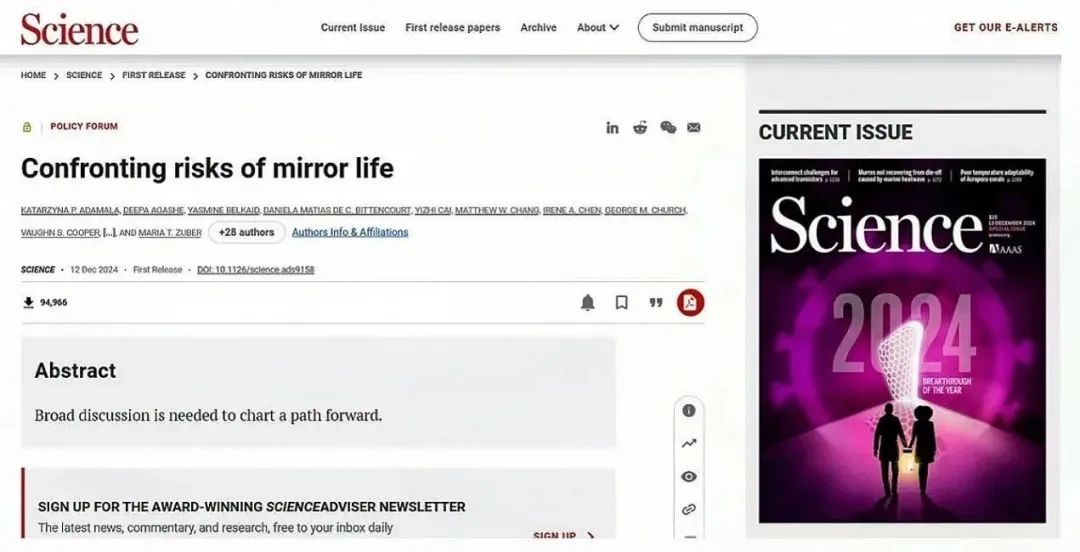 2024年12月11日,《Science》杂志发表了一篇长达299页的报告《直面“镜像生命”的风险》(Confronting risks of mirror life)。报告由来自9个国家的38位诺贝尔奖得主和行业专家联合撰写,呼吁全球禁止对镜像生命的研究[1]。