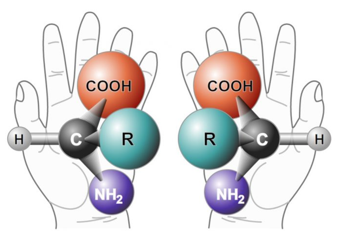 构成生命体的有机分子,绝大多数都是手性分子。手性分子分左旋(左手性)和右旋(右手性)两种形式,通常用 L- 表示左旋,D- 表示右旋。当科学家在实验室合成有机化合物时,获得的左、右旋分子通常各占一半。
