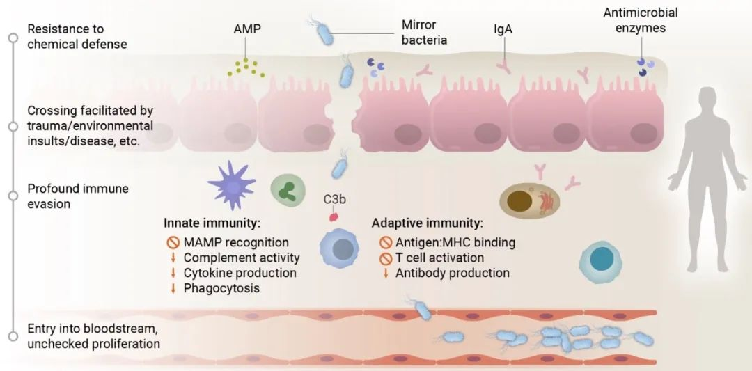 镜像细菌可能逃脱免疫系统的识别,无法激活相应的免疫细胞去清除它,最终进入血液里,不受控地大量繁殖|图源:参考文献[1]