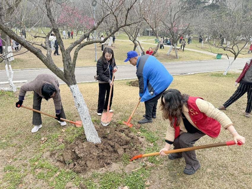 活动现场,社区居民们全身心投入到这场植绿热潮中。大家热情高涨,分工明确,有的拿着铁锹为樱花园和梅花园的树木松土,有的为树木浇水施肥,还有的记名为树木挂认养牌,现场一片繁忙而有序的景象。“给树木松土不仅可以促进植物生长,还可以增加土壤通气性,促进植物根系的呼吸和生长,提高植物的抗病能力和适应能力,从而促进植物生长和发育。”青山公园工作人员在一旁为大家细心讲解。