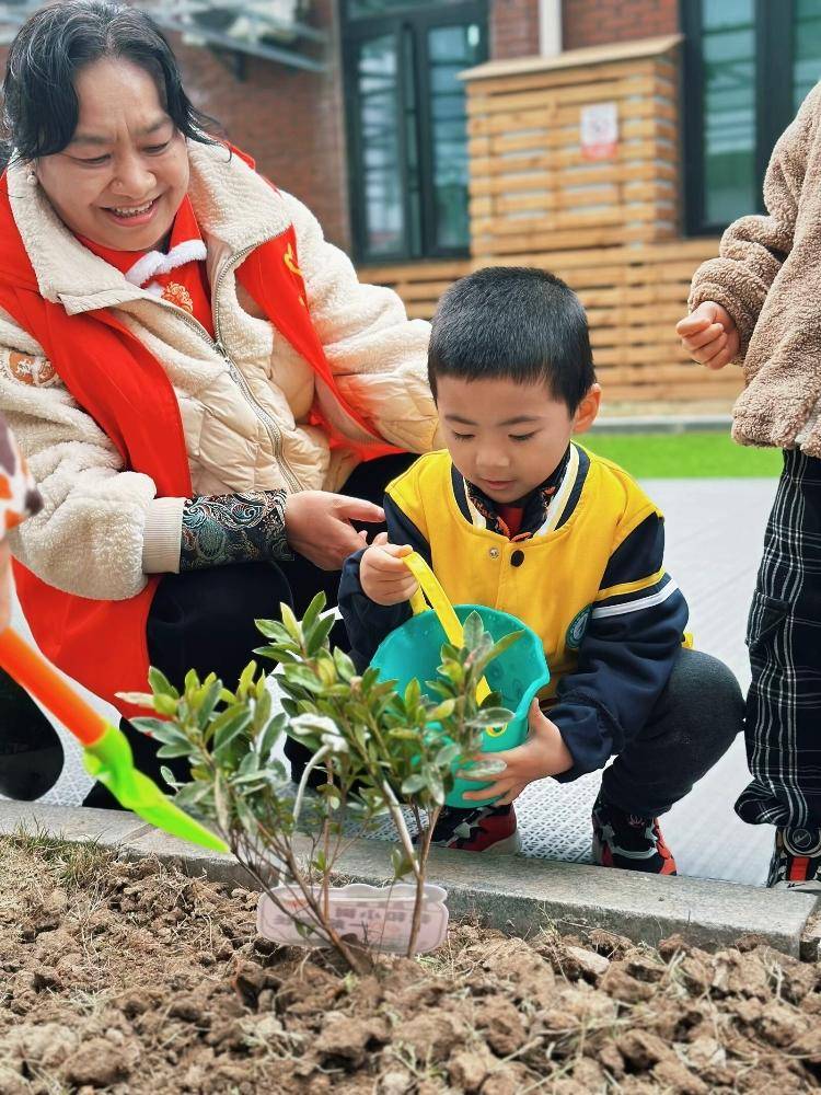 趁着大好春光,孩子们撸起袖子、拿起小铲子、提起小水桶化身“小小园丁”,有的用小铲子挖坑,有的小心翼翼扶正树苗,有的拎着小水壶浇灌……“小树苗喝饱水,就能长高高啦!”孩子们兴奋地喊着。每棵小树苗都挂上了孩子们亲手绘制的“树牌”。有的画上灿烂的笑脸,有的写下“我和小树一同成长”,还有的按上彩色手印作为承诺。孩子们还约定平时定期来照顾自己的小树苗,观察它的成长。
