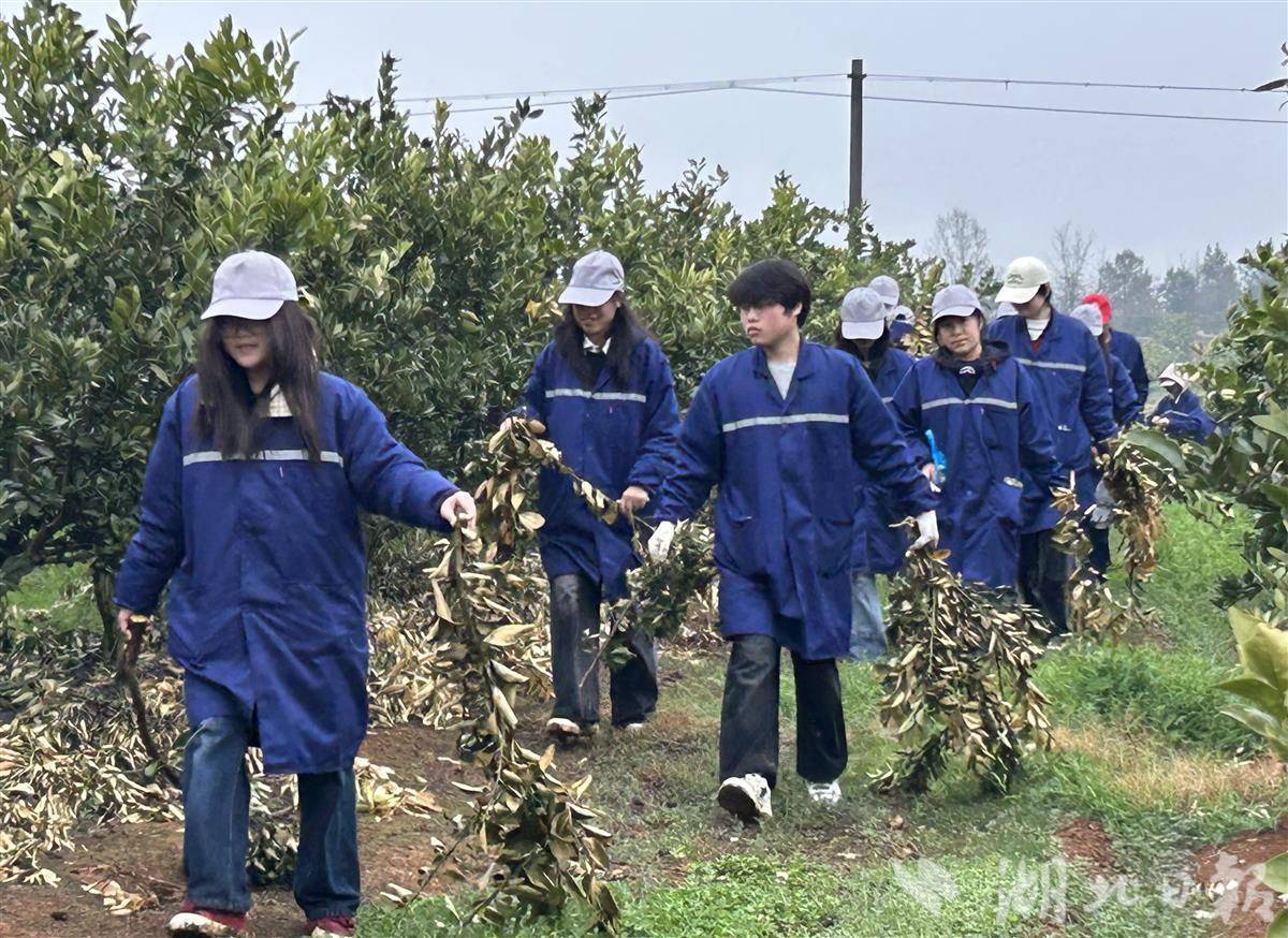 学生们对田间的柑橘树进行修剪。(湖北日报全媒记者 秦发 摄)