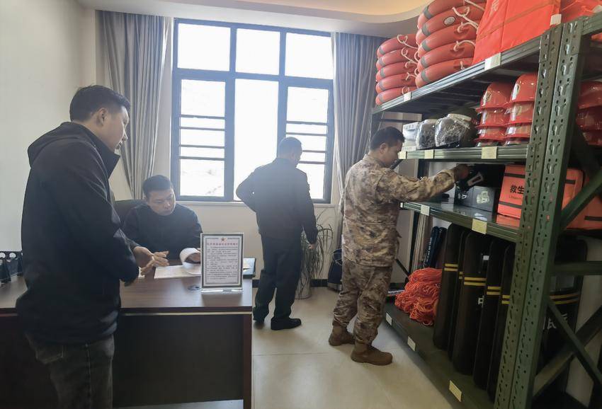 侯海山一行深入装备器械室、民兵连办公室及”民兵之家”3大功能区域,重点核验防暴器材、防汛设备等物资储备情况,现场测试应急装备完好率,逐一核对60名基干民兵身份信息,详细查阅各类活动记录,并就存在的部分问题,提出了相应的整改意见。