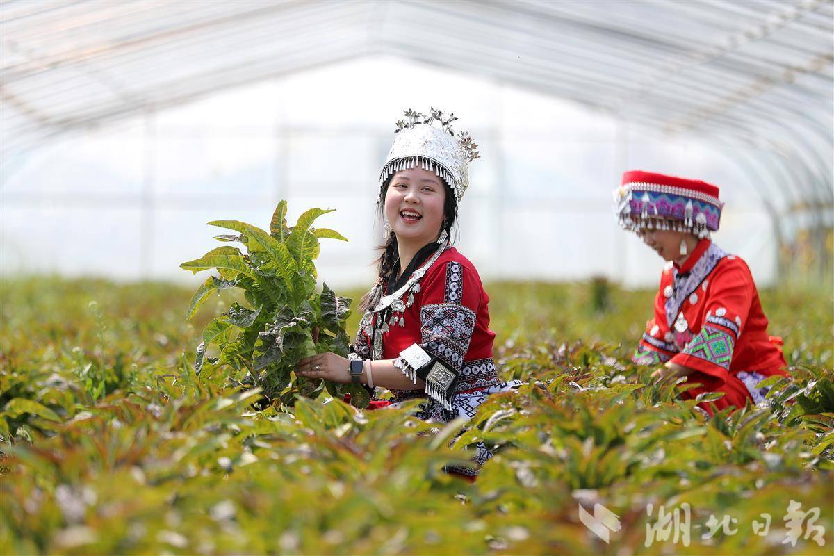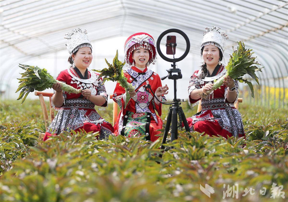 3月19日,沙洋县沙洋镇三峡土家族村的蔬菜大棚里,身着土家族盛装的村民们化身“主播”,热情洋溢地向各地推销着刚刚收获的新鲜莴笋。当天,村里40亩莴笋迎来了大丰收,村民们正精心地分拣、仔细地打包,将最新鲜的莴笋第一时间供应到春季市场。(视界网 赵平 摄)