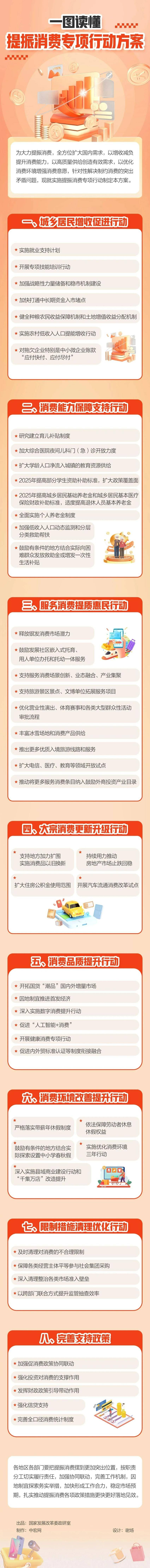 湖北日报客户端讯(通讯员蔡金晶)近日,中共中央办公厅、国务院办公厅印发《提振消费专项行动方案》,并发出通知,要求各地区各部门结合实际认真贯彻落实。行动方案部署了8方面30项重点任务,包括城乡居民增收促进行动、消费能力保障支持行动、服务消费提质惠民行动、大宗消费更新升级行动、消费品质提升行动、消费环境改善提升行动、限制措施清理优化行动、完善支持政策。