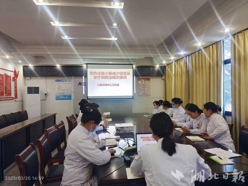 湖北日报客户端讯(通讯员 陈照英 吴昌慧)随着3-4月份发热伴血小板减少综合征高发季节的来临,为提升医疗救治水平、强化防控能力,3月20日,六里坪镇中心卫生院组织临床科室医务人员开展了关于发热伴血小板减少综合征诊疗方案和防控方案的集中学习活动,为守护辖区居民健康筑牢防线。