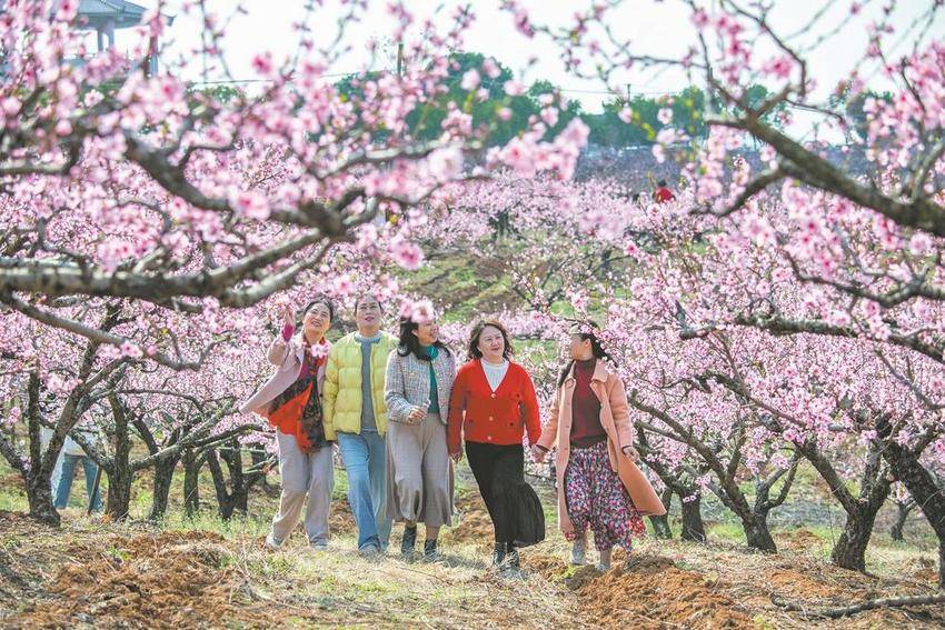 3月中旬,桃花在枣阳由南至北次第开放,百公里的桃花长廊让游客尽情领略“人面桃花相映红”的春意。图为游人在平林镇四井岗村桃园赏花。(来源:襄阳日报)