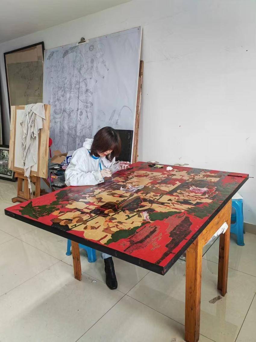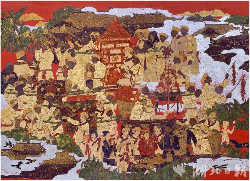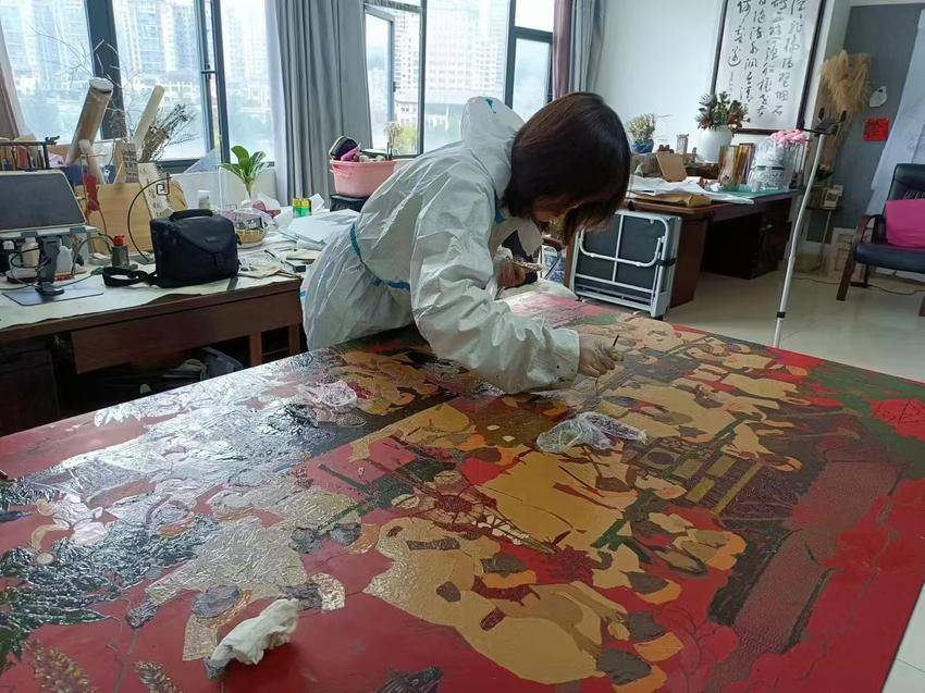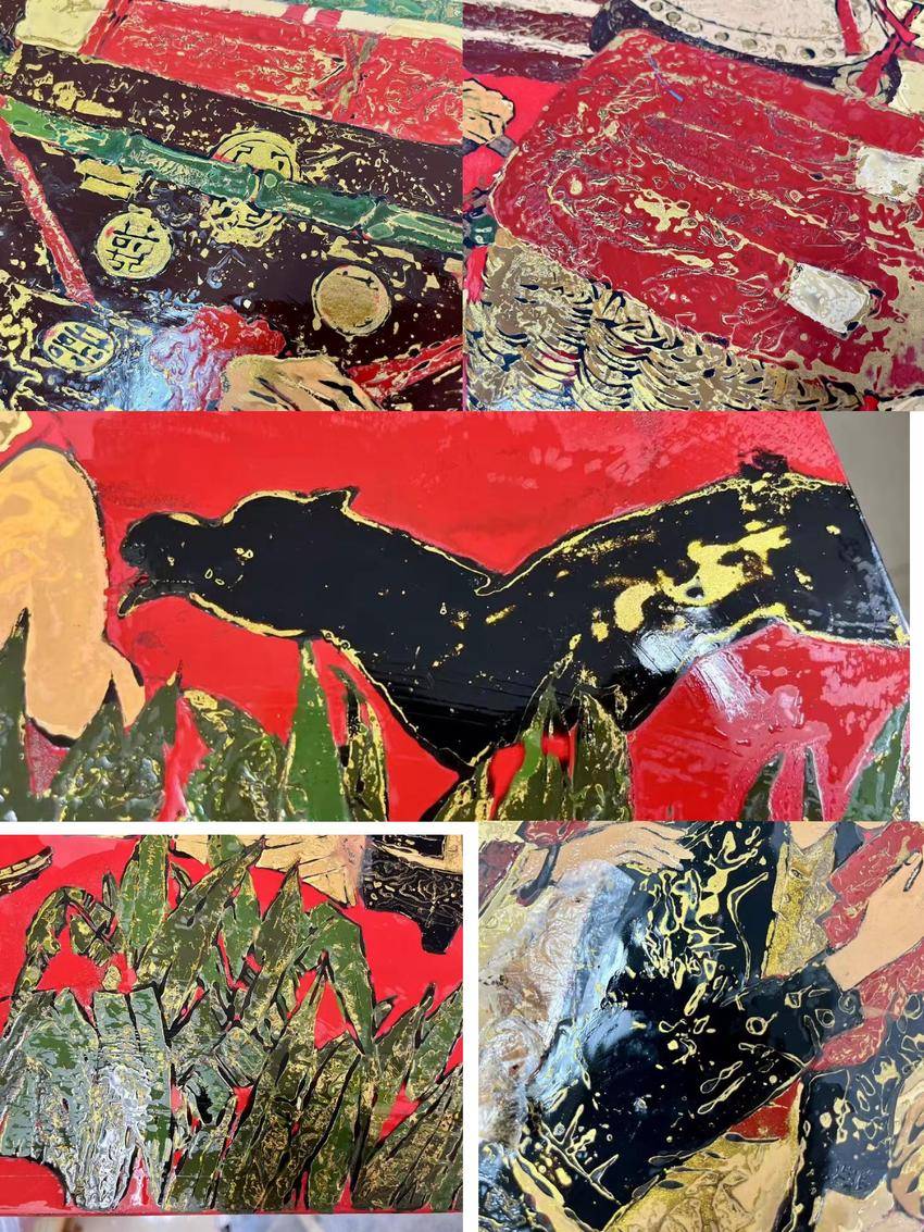 对擅长中国画的屈玫均而言,这次创作是其艺术生命的全新尝试。她在采风笔记中写道:“大漆的脾气像武陵山的云雾,要懂得等待它从乳白转为透红的最佳时机。”在传承人指导下,她将中国画的描摹,融入漆画平面构成,让土家族哭嫁歌队的环形阵列产生舞台剧般的纵深效果。