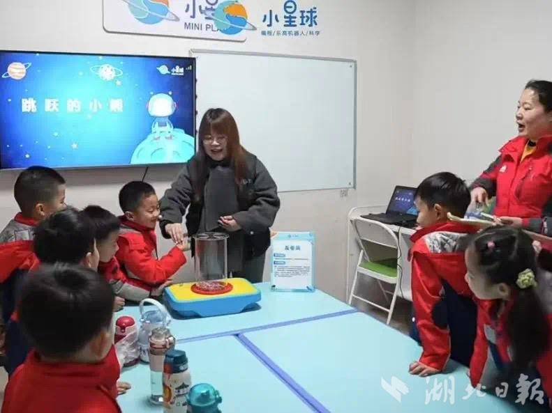 AI编钟系统奏响古老的旋律,孩子们跟着哼唱,传统与现代完美融合,楚文化焕发出新的生机。“彩虹火山”的喷发让孩子们的眼睛瞪得大大的,原来干冰能让彩色的水发生奇妙的变化!观看“魔法空气炮”时,孩子们兴奋地拍手,没想到空气炮是从卷筒里飞出来的,这奇妙的现象让他们对科学的兴趣更加浓厚。