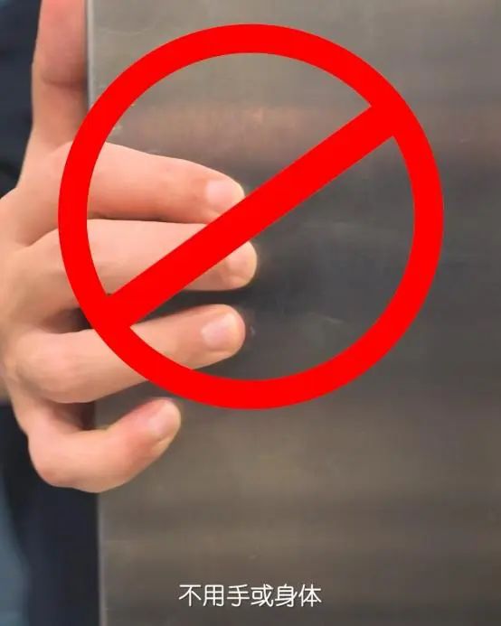✅正确:按电梯按键开门,不用手、脚和物体遮挡电梯。
