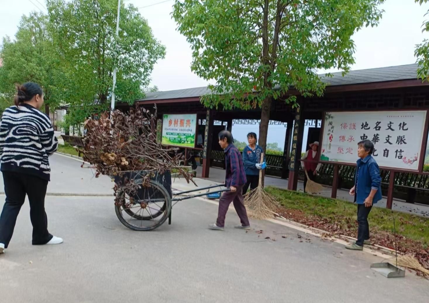 沿着主干道两旁的“蓝色飘带”前行,处处可见红马甲们热火朝天的劳动场景,他们行走在湾组的各个角落,两三人一组,有的手拿大扫帚清扫,有的拿着铁锹当垃圾铲,有的推着小车运送垃圾,经过一上午的埋头苦干,湾组道路清洁干净,乡村面貌焕然一新。