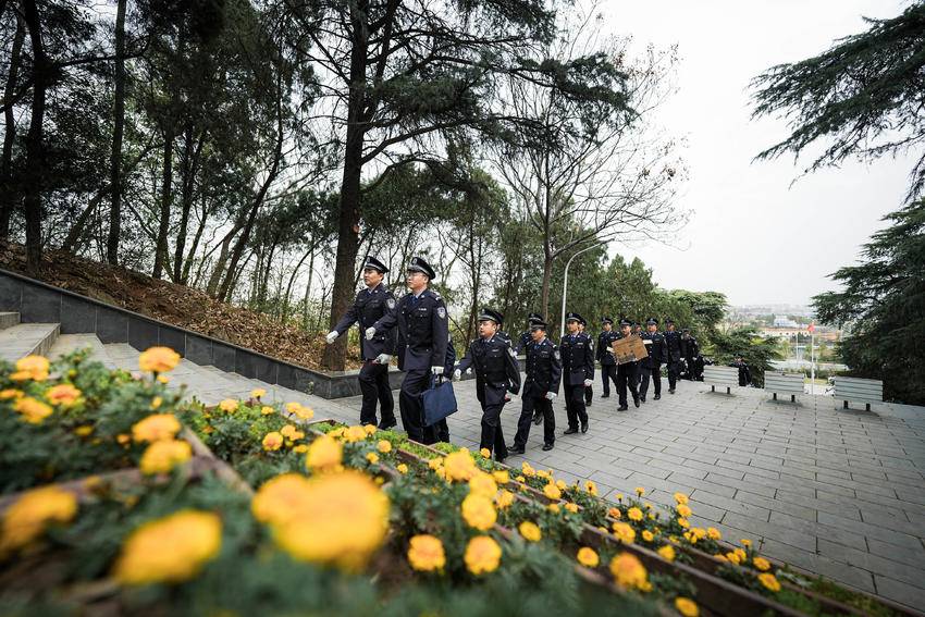 默哀毕,青年民警手持菊花,缓缓走向烈士纪念碑。一朵朵花儿,如同他们一颗颗炽热的心,表达着对英烈的敬仰与缅怀之情,那整齐的步伐、凝重的神情,是青年民警对先辈们无声的承诺:精神不灭,传承有我。