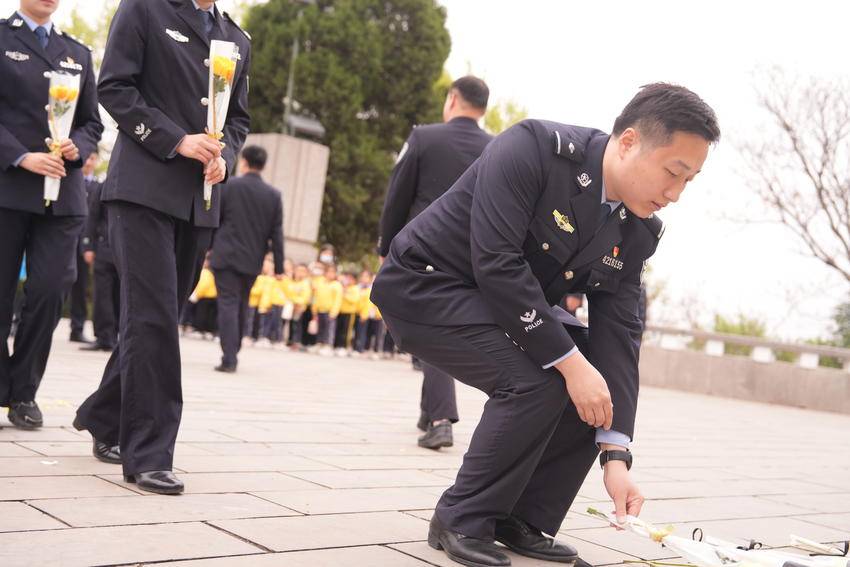 随后,全体青年民警依次走到纪念塔前,献上手中菊花,深深鞠躬,表达对烈士们的无限敬仰和追思。