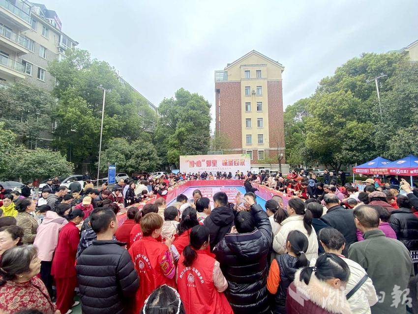 文艺演出结束后,备受瞩目的“百家宴”将活动氛围推向高潮。300余道风味各异的佳肴铺陈长桌,汇聚天南海北的舌尖风情:热气腾腾的火锅象征红火日子,酥香四溢的烤全羊传递草原豪情,精巧的糕点甜品满载甜蜜祝福,更有居民拿手家常菜、商铺特色美食、包联单位的暖心餐点……每一道菜肴背后都是“一家一故事,一菜一温情”。居民们围桌而立,一边品尝美食,一边畅所欲言,在热闹的烟火氛围中,心与心的距离越拉越近。