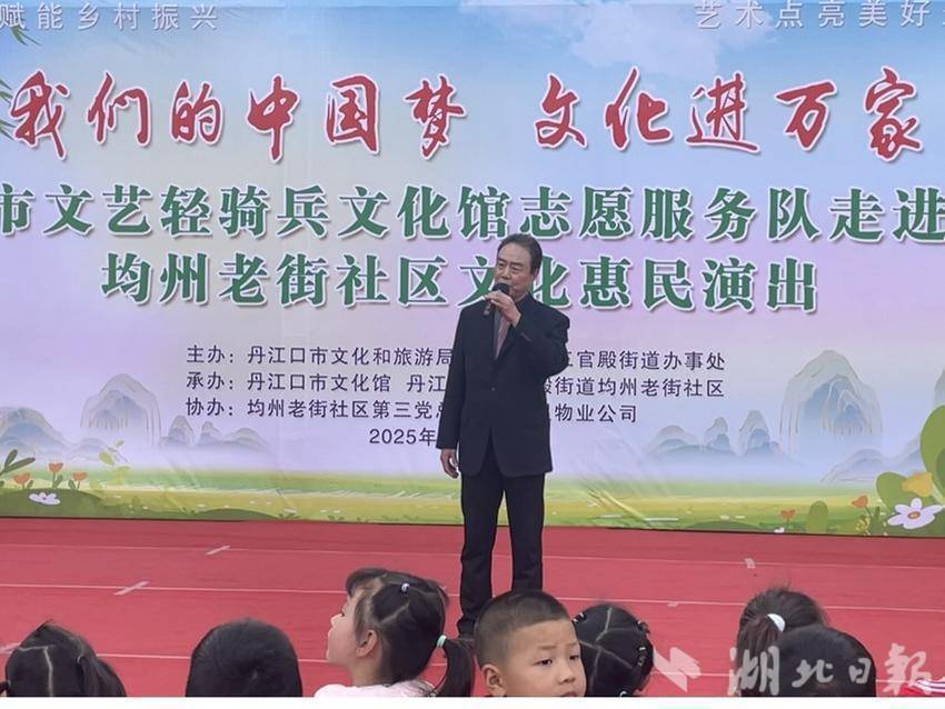 文化馆文艺志愿者呈献独唱《妈妈的手》,深情歌声传递母爱之温暖。在与观众的互动环节,志愿者以真挚情感,将演出氛围推向高潮。均州老街社区幼儿园的小朋友们表演舞蹈《少年加加油》,活力四射的表演逗乐观众,现场笑声不断。