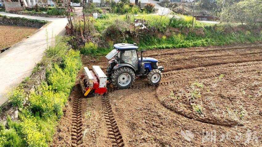 湖北日报客户端讯(通讯员 何明君 王文强)近日,宜都市姚家店镇油榨坪村抢抓农时,采用机械化种肥同播技术开展春玉米播种作业。