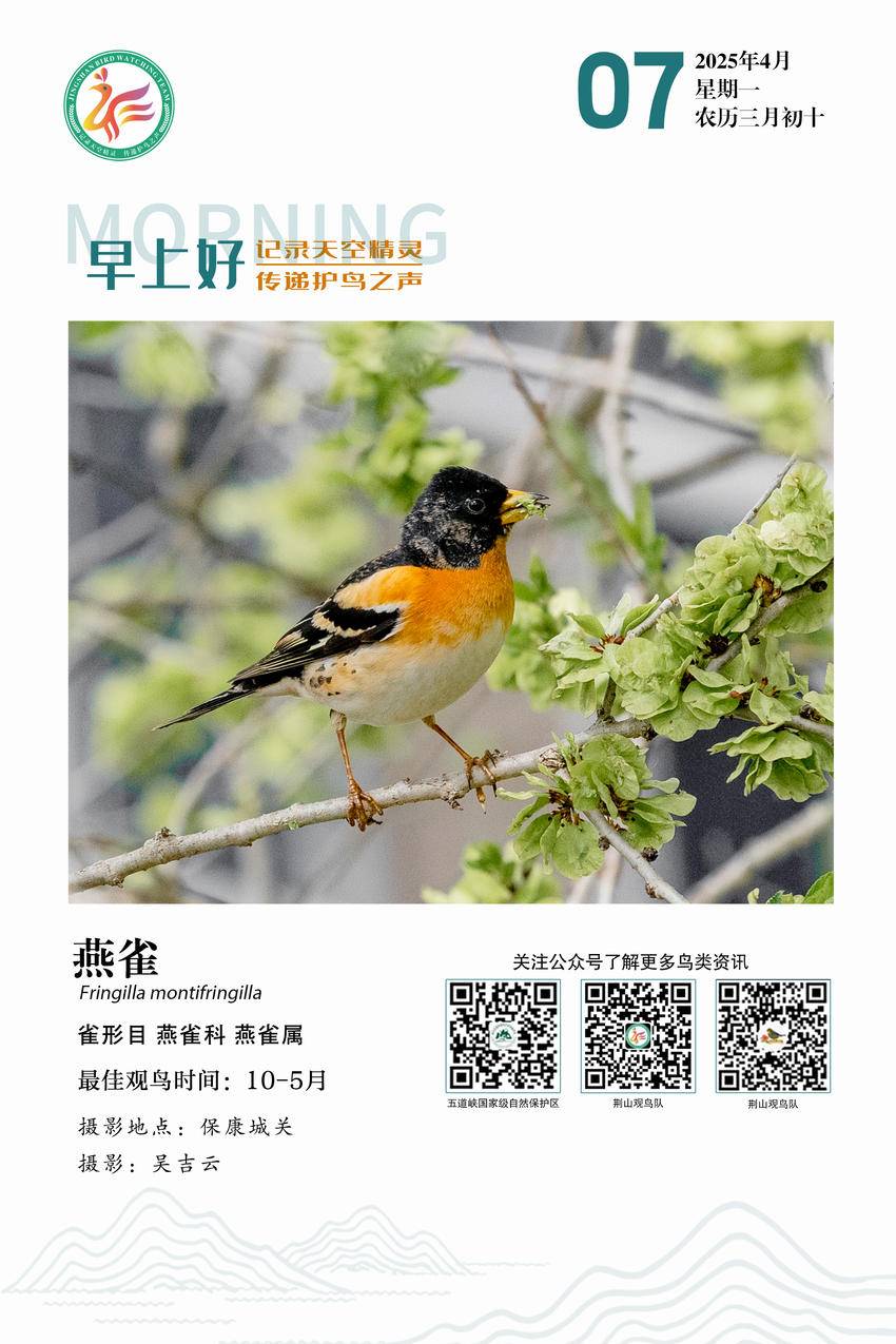 燕雀(英文名:Brambling,学名:Fringilla montifringilla),是雀形目燕雀科燕雀属的小型鸟类。被称为虎皮燕雀、虎皮雀、花鸡、花雀。繁殖期间成对活动,其余季节多成群,迁徙期间可形成大群。分布于北欧、亚洲、南欧等地,主要栖息于平原、丘陵到山区的各类森林中。(来源:湖北五道峡国家级自然保护区管理局)