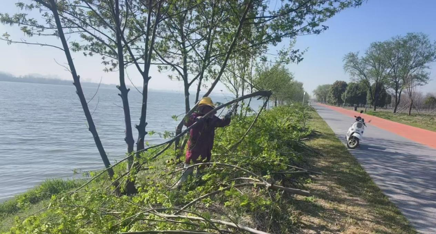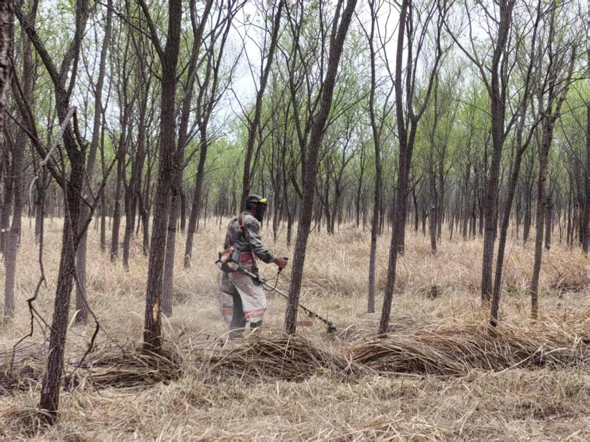在重点修剪枫杨的同时,养护团队对毗邻的杨树林区开展延伸治理,主要针对林下枯枝落叶堆积、易燃植被丛生等情况,采用人工与机械结合的方式。“杨树喜光,清杂不仅降低火险,还能改善林下通风透光条件,促进林木健康生长。”技术人员现场解释道。