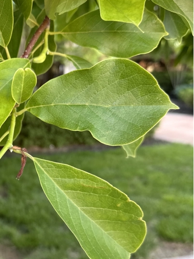 叶:单叶互生,叶纸质,倒卵形,长6-15厘米,宽4-7.5厘米,先端短急尖,2/3以下渐狭成楔形,上面基部中脉常残留有毛,下面多少被柔毛,侧脉每边7-9条,干时两面网脉凸起,叶柄长1-1.5厘米,被柔毛,托叶痕约为叶柄长的1/3。