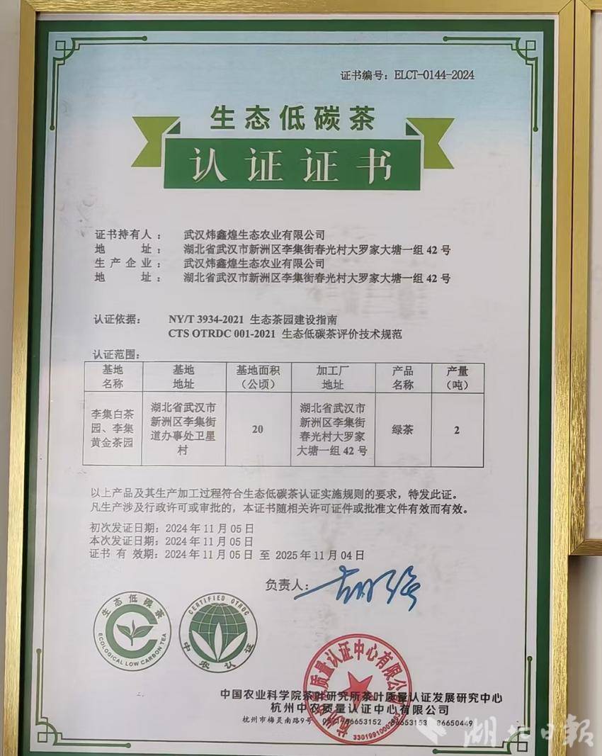 为推动产业发展,李美秀成立了武汉炜鑫煌生态农业有限公司,相继了注册“李集白茶”和“紫潭问津红茶”品牌商标。茶园严格遵循国家绿色标准,施肥以腐熟农家肥为主,病虫害防治优先采用物理和生物手段,如设置防虫网、遍挂诱虫灯等,以保障茶叶品质。2024年11月5日,茶园获得了生态低碳茶的认证证书。茶园生产的白茶、黄金茶和红茶以卓越品质,深受消费者喜爱与信赖。