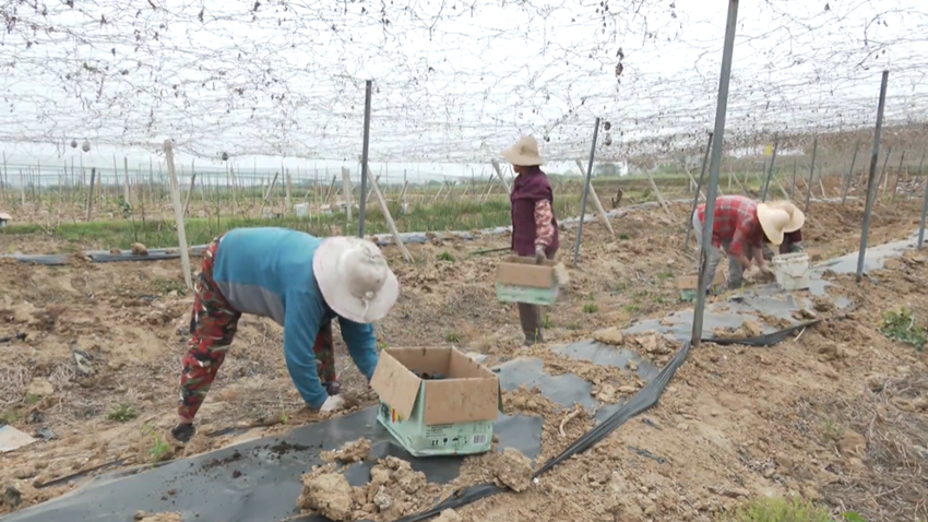 11日,记者在合作社的瓜蒌种植基地看到,十余名工人正在忙着将瓜蒌苗种入地膜下方,挖坑、放苗、盖土一气呵成,现场一片热火朝天的农忙景象。