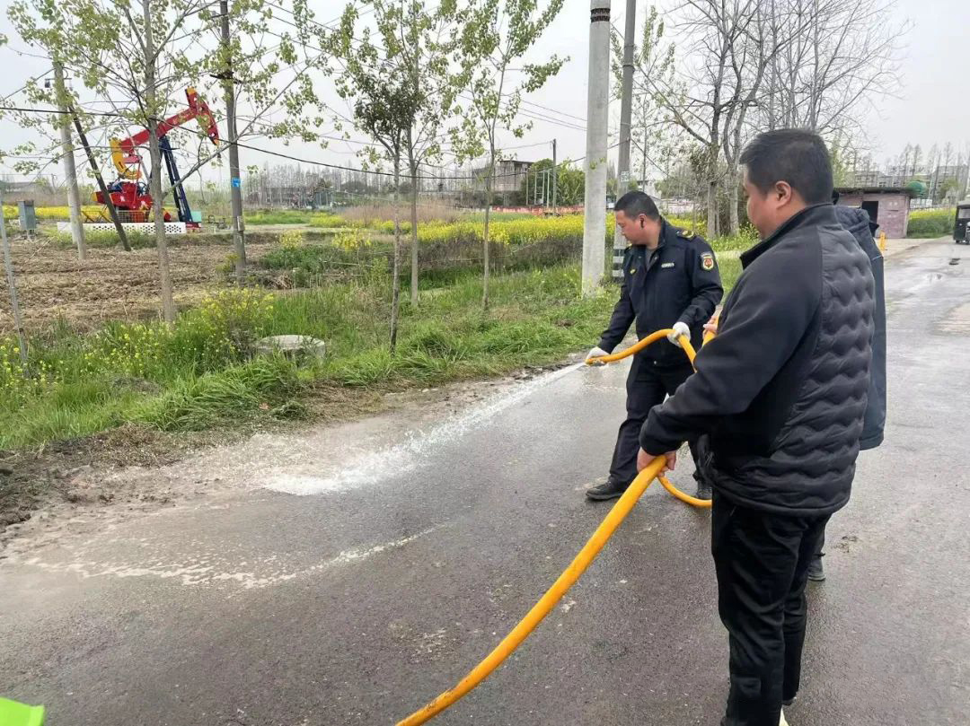 清洗过程中,部分同志负责操作水管设备,部分同志及时清除被水流冲散的垃圾,确保整个清洁工作高效、有序进行。经过数小时努力,辖区街道面貌焕然一新,道路两侧环境清新宜人。