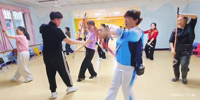 “手腕放松,手杖点地,对!跟着节奏来……”培训现场,教练们教得格外用心,一边用生动幽默的语言拆解动作要领,一边亲自示范,带着学员们反复练习。那些平日里握惯了锄头的村嫂们,此刻手持健身杖,学起握杖、摆臂、走步、转体等动作竟也有模有样。短短两天,大家的动作就从生涩到流畅,最后甚至能随着音乐节拍“杖”起舞动,步伐稳健如行云流水。