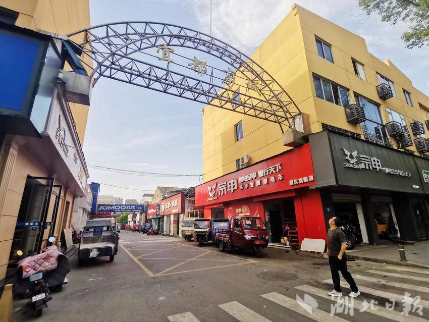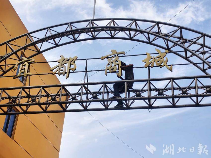 网格员张平日常巡查时,发现悬挂的“宜都商城”标识牌“商”字边框严重松动,金属支架在风中微微晃动,正下方便是行人往来的通道。