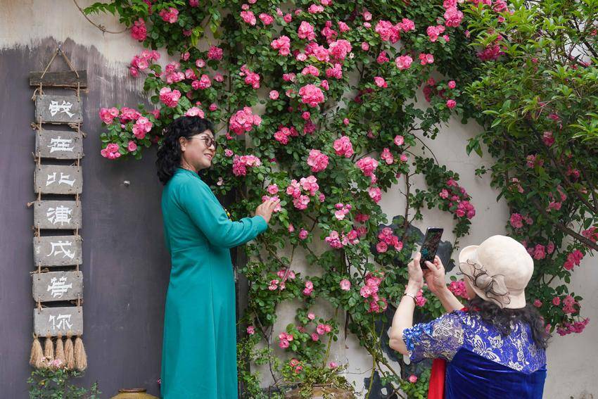 蔷薇花海吸引了众多摄影爱好者前来打卡。无论是专业摄影师,还是普通的摄影爱好者,都能在这里找到属于自己的灵感和创作素材。花墙下,身着汉服、旗袍或春日连衣裙的市民和游客们,摆着各种优美的姿势,与蔷薇花合影留念,留下了一张张唯美的照片。
