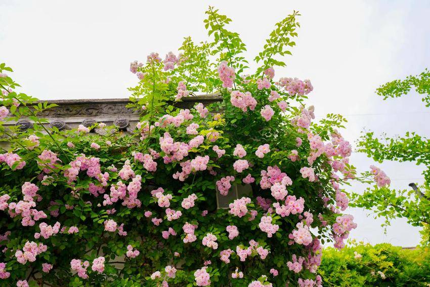 走进襄阳古玩城,仿佛踏入了一个童话般的世界。只见蔷薇花密密匝匝地攀附在古玩城的围墙上,如同一片粉色、白色、玫红色交织而成的花瀑,从墙头倾泻而下。每一朵花都在阳光下尽情绽放,花瓣娇嫩欲滴,像是春日里最柔软的诗行,又似天边绚丽的彩霞,将整个古玩城装点得如诗如画。