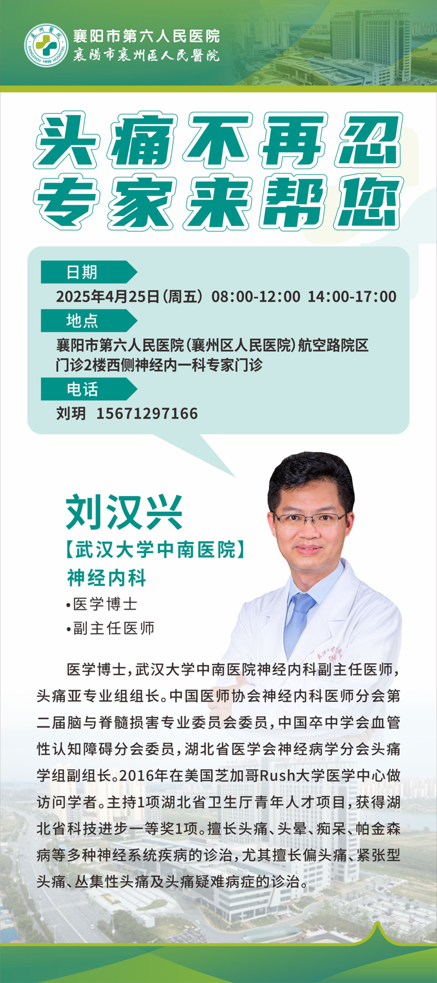 湖北日报讯(记者刘孝军、通讯员程贺轶、程宇虹)4月22日,从襄阳市第六人民医院(襄州区人民医院)获悉,4月25日(本周五)武汉大学中南医院神经内科医学博士、副主任医师、头痛亚专业组组长刘汉兴,将亲临该院接诊各种头痛病患者。这是该院首次开设头疼专病门诊,将为襄阳各种顽固性头疼患者提供专业的诊疗服务。
